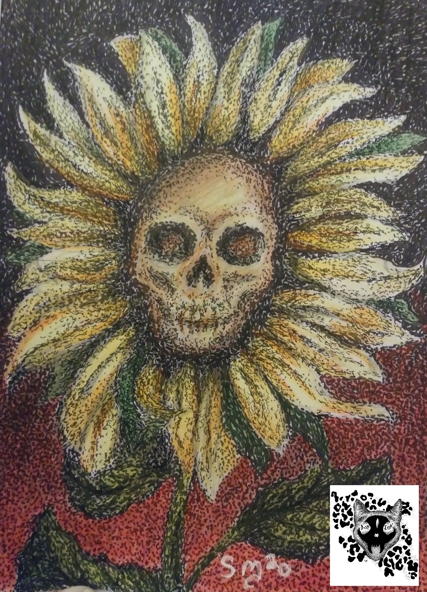 Sunflower Skull, 5x7 options of a pointillism style print on cardstock. Original creepy design. The original took 5+ hrs to complete! All dots are inked, with colored pencil added.